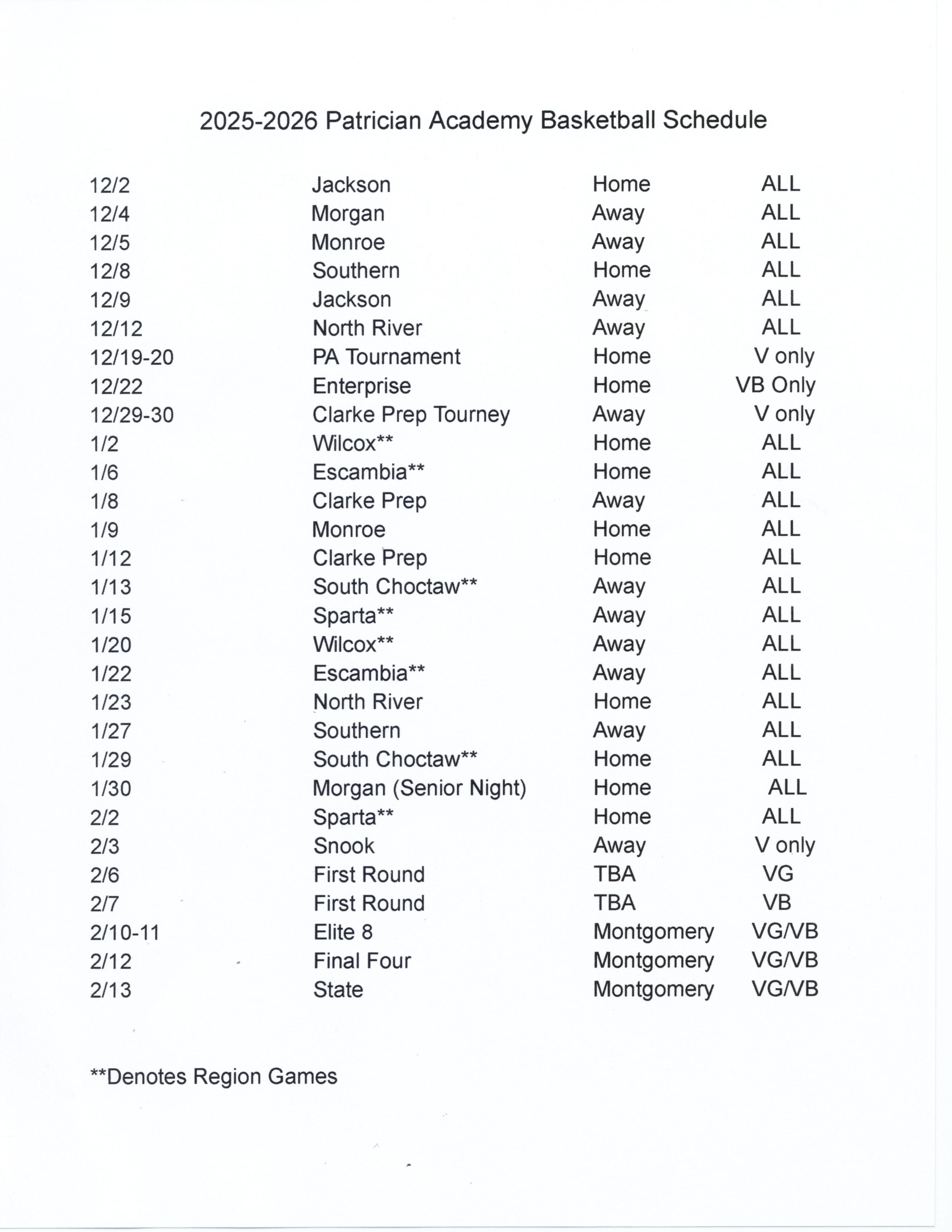 PA Sports Deer Hunt Form School Calendar PA Newsletter Patrician March Madness Supply List Awards & Recognition Student Life PA Sports Sports schedules are subject to change. Please check back closer to start of the season. Volleyball 2025 https://www.pasaints.com/editoruploads/files/2025%20Volleyball.pdf Varsity Football 2025 https://www.pasaints.com/editoruploads/files/2025%20Varsity%20Football%20Schedule.pdf JV and Pee Wee Footballhttps://www.pasaints.com/editoruploads/files/2025%20JV%20%26%20Pee%20Wee%20Football%20Schedule.pdf Patrician Academy Basketball 2025-2026 Baseball Schedule 2025 Softball Schedule 2025 Golf Schedule 2025 Track Schedule 2024 Pee wee baseball and softball 2025